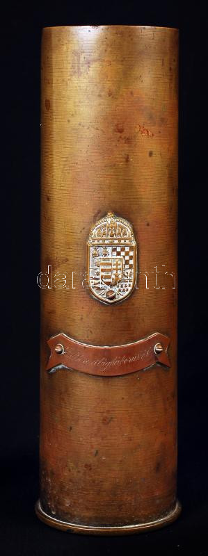 cca 1916 ágyúhüvelyből készített váza, "Emlék a világháborúból" plakettel és a magyar középcímerrel, réz, m: 28,5 cm