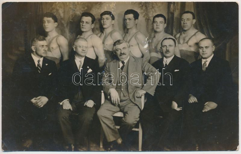 1928 A magyarországi 1928. évi birkózó csapatbajnokság helyezettjei, Ryba Géza Fényképészeti és Festészeti Műterme, felülete sérült, 14x9 cm