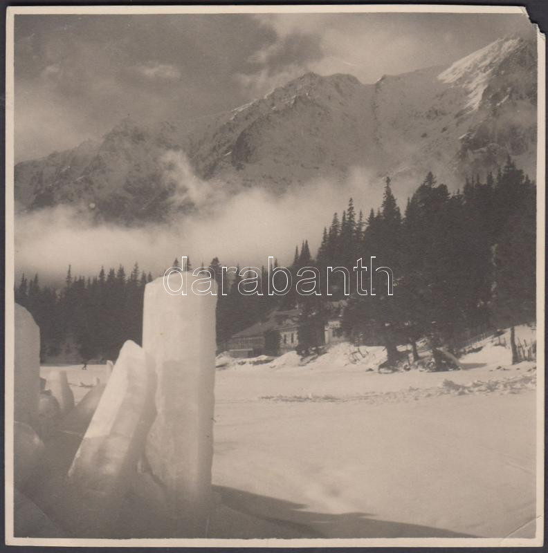 1930 Poprádi tó, jelzetlen, feliratozott, sarka sérült, 12,5x12,5 cm /