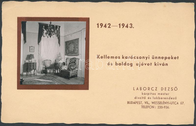 1942-1943 Laborcz Dezső kárpitos mester karácsonyi-újévi reklám kártyá...