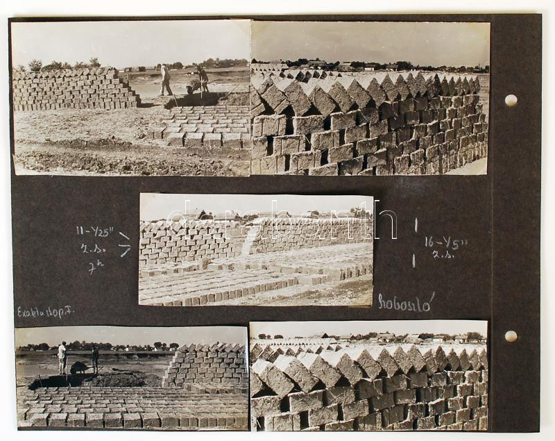 1958 Vályogvetők Hajdúszoboszlón, 10 db fotó albumlapra ragasztva, 12x4,5 és 12x8 cm közötti méretekben