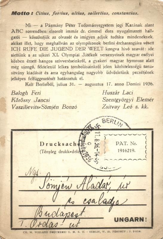 Drucksache / Pázmány Péter Tudományegyetem jogi karán végzett hallgató... https://www.darabanth.com/en/220-Online-auction/220.0/Postcards/Olympic-Games~6000351/Drucksache-Pazmany-Peter-Tudomanyegyetem-jogi-karan-vegzett-hallgatok-olimpiai-drukkolo-la~II942962