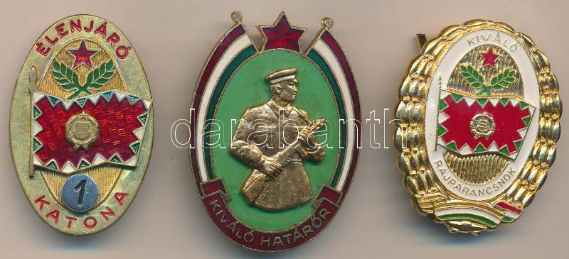 ~1960. "Kiváló Rajparancsnok" aranyozott, zománcozott fém jelvény + "Élenjáró Katona" zománcozott fém jelvény + "Kiváló Határőr" zománcozott fém jelvény. Szign.: PV. T:2 zománc hiba