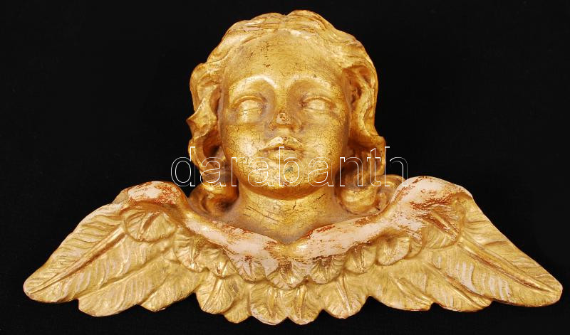 Antik angyal fejes ajtódísz, faragott fa, kopott aranyozás, 12×20 cm