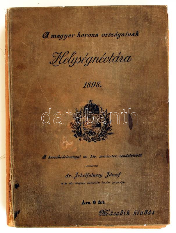 A Magyar Korona Országainak helységnévtára 1898. Szerk.: Jekelfalussy ... https://www.darabanth.com/en/221-Online-auction/221.0/Other-collectibles/Books-Travelling-cities~1600013/A-Magyar-Korona-Orszagainak-helysegnevtara-1898-Szerk-Jekelfalussy-Jozsef-Bp-1899-Pesti-~II950341