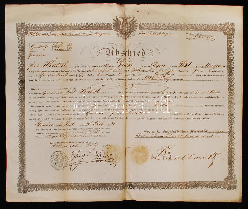 https://www.darabanth.com/en/221-Online-auction/221.0/Other-collectibles/Military~1600005/1843-Pest-Katonai-szolgalatbol-valo-hivatalos-elbocsato-level-nemet-nyelven-szarazpecsette~II953498