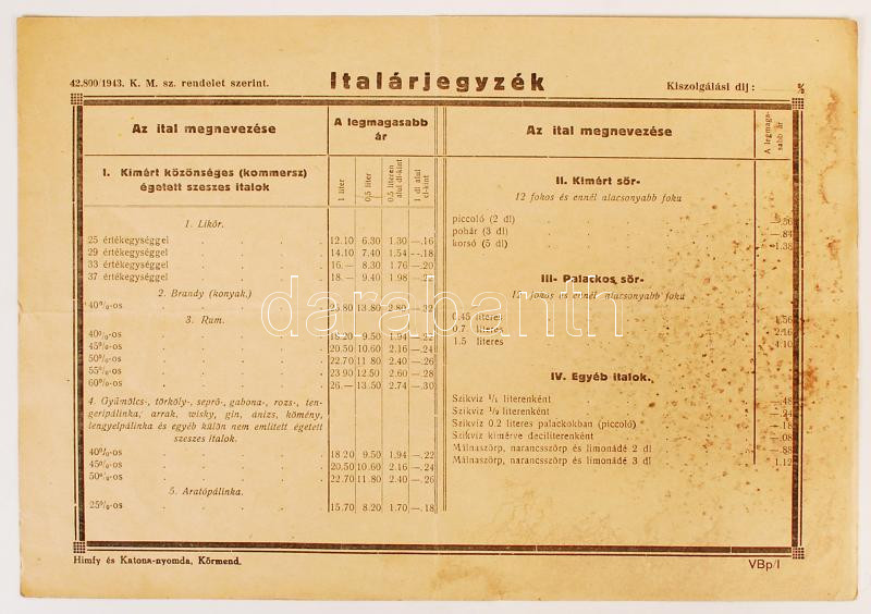 1943 A magyar állam által kiadott hivatalos italárjegyzék a lehetséges legmagasabb ár megjelölésével