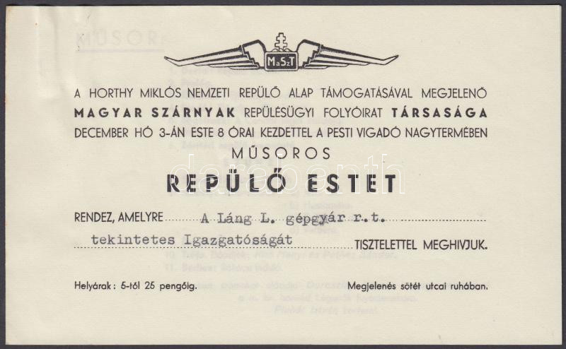 cca 1940-1944 Meghívó a Magyar Szárnyak repülésügyi folyóirat által rendezendő repülő estre