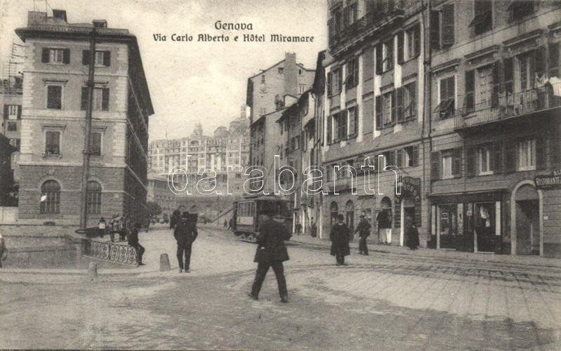 Genova, Via Carlo Alberto, Hotel Miramare / street, hotel, restaurant, tram