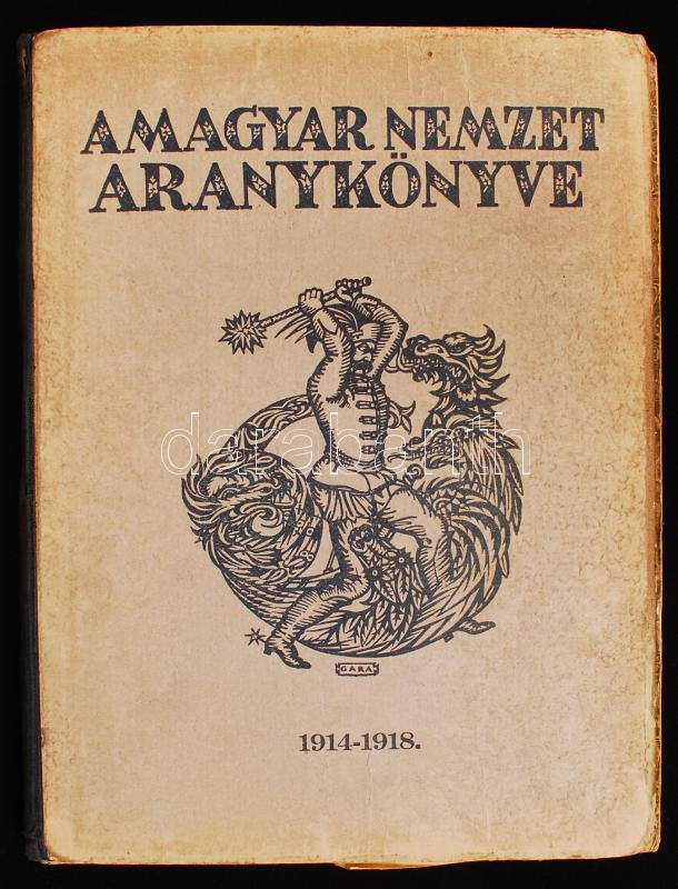 A magyar nemzet aranykönyve 1914-1918. Bp., 1921, A magyar nemzet aranykönyve szerkesztÅ‘-bizottsága. ElsÅ‘ világháborús képes katonai életrajzokkal. Kartonált papÃrkötésben, a borÃtó részben elválik, egyébként jó állapotban.