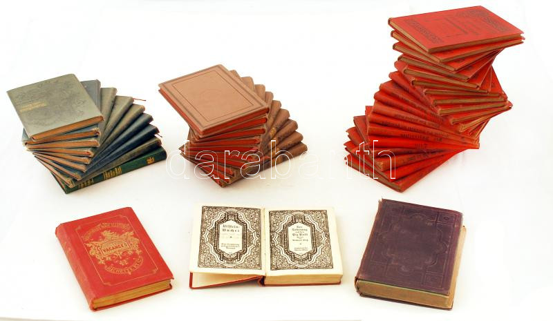 43 darabos nagy regény tétel: különféle régi német könyvsorozatok kötetei (Collection Hartleben: 8 db, Prohaskas Monat-Bände: 10 db, Engelhorn's allgemeine Roman-Bibliothek: 20 db), néhány különálló kötet (Shakespeares dramatische Werke 1. köt.; Ausgewählte Werke von E. T. A. Hoffmann 1. köt; Voß, Richard: Der Todesweg auf den Piz Palü), valamint 1 db francia nyelvű regény (Madame la Comtesse de Ségur: Les vacances). Kötetenként változó állapotban, többnyire kopottas kötésben, de jó állapotban.
