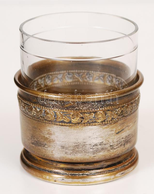 Kis üveg tárolóedényke, díszes fém talapzattal, d: 5 cm, m: 6 cm