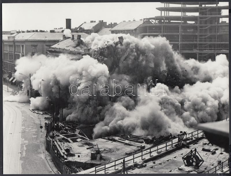 cca 1980 Budapest, a Marx (ma Nyugati) téri aluljáró rendszer épÃtése miatt egy teljes háztömböt robbantással bontottak el, 3 db várostörténeti jelentÅ‘séggel bÃró fotó a robbantásról, 18x24 cm
