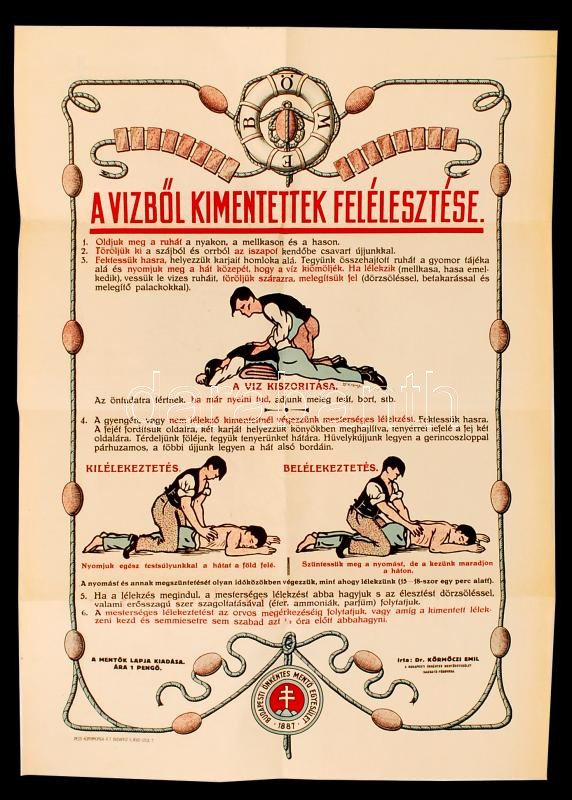 1926 Népszerű utmutató az első segélynyujtáshoz. írta: Nadasdi Sárközy Róbert dr., Somogyvármegye nagyatádi járásának tiszti orvosa. Nagyatád, 1926, Benyák János. A vízből kimentettek felélesztése plakát melléklettel. 50x35cm