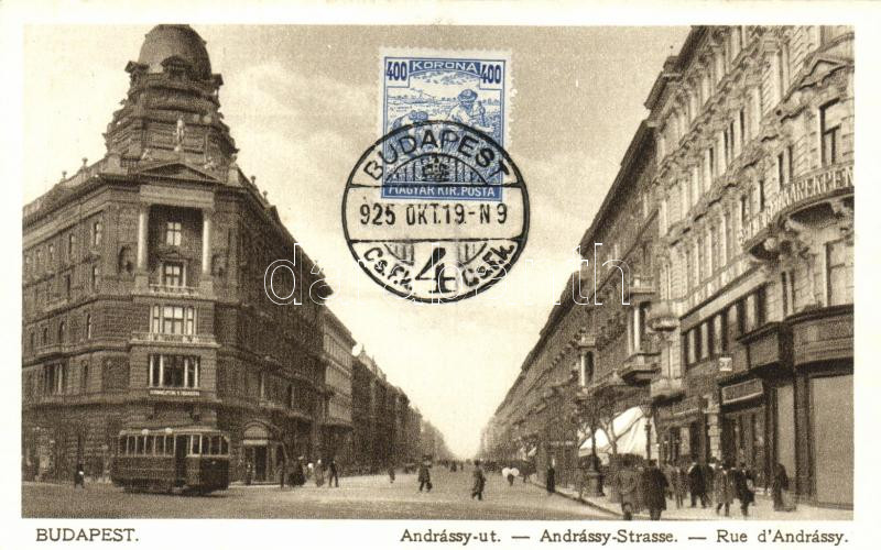 Budapest VI. Andrássy út, villamos, Takarékpénztár, Rigler, 55. sz.