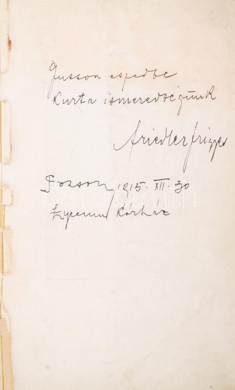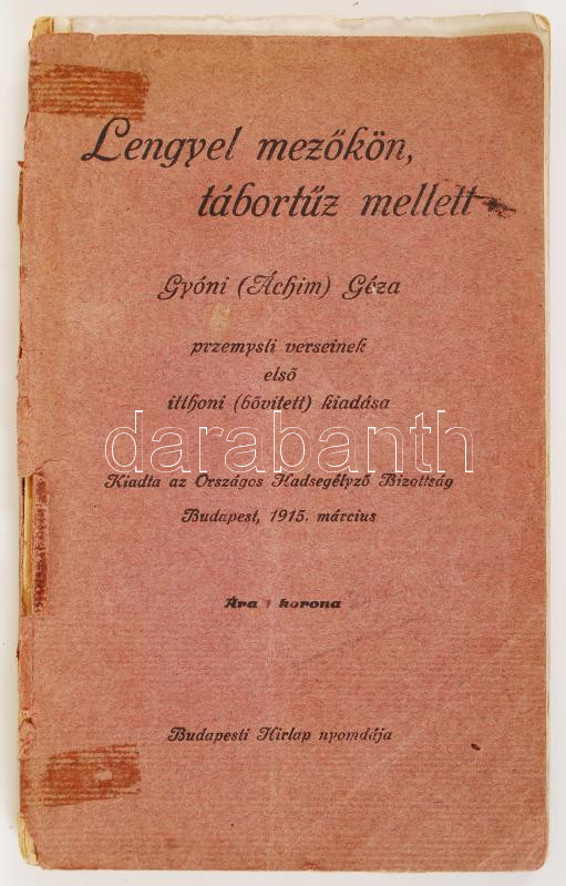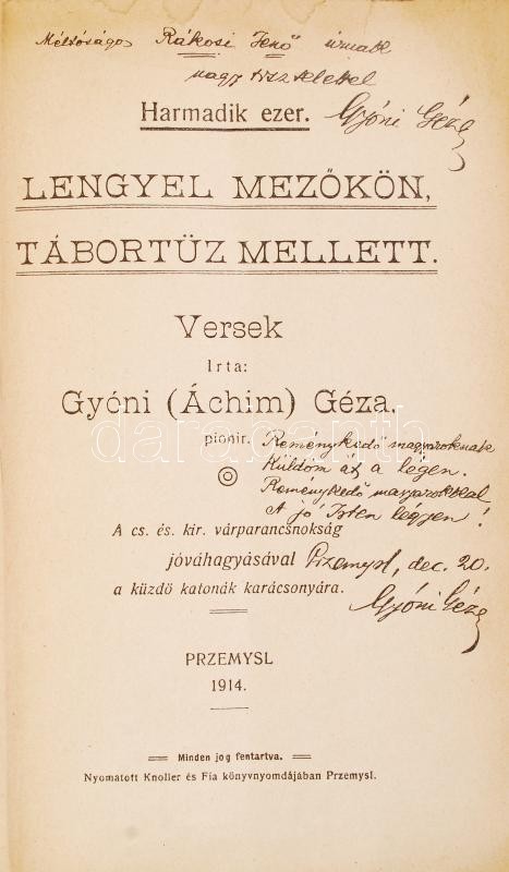 Gyóni Géza: Lengyel mezőkön, tábortűz mellett. Gyóni (Áchim) Géza przemysli verseinek első itthoni (bővített) kiadása. Bp., 1915, Országos Hadsegélyező Bizottság. Az 1914-es kiadás nyomdahű másolata, Gyóni Géza nyomtatott aláírásával és dedikációjával Rákosi Jenő (1842-1929) író, újságírónak. Az elején érdekes, valószínűleg katonai vonatkozású ajánlással. Utólag ragasztott, szakadt papírkötésben, egyébként jó állapotban.