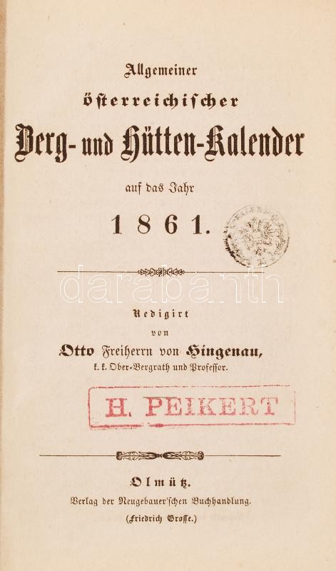 Allgemeiner österreichischer Berg- und Hütten-Kalender auf das Jahr 1861. Szerk.: Hingenau, Otto. Olmütz, 1861, Verlag von Neugebauer'schen Buchhandlung. Kicsit kopott, aranyozott vászonkötésben, egyébként jó állapotban.