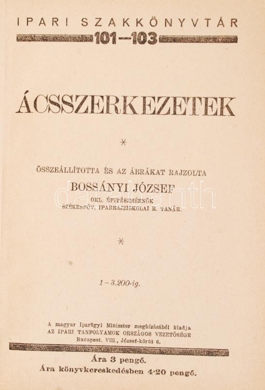 Description: Bosányi József (szerk.): Ácszsrekezetek. Ipari szakkönyvtár 101-103. Bp., é.n., Az Ipari Tanfolyamok Országos Szövetsége.