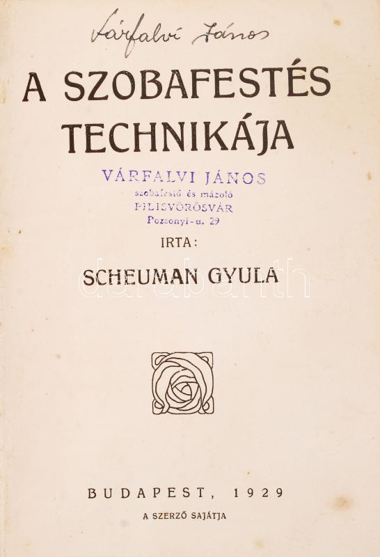 Scheuman Gyula: A szobafestés technikája. Bp., 1929. Kicsit vetemedett vászonkötésben, egyébként jó állapotban.