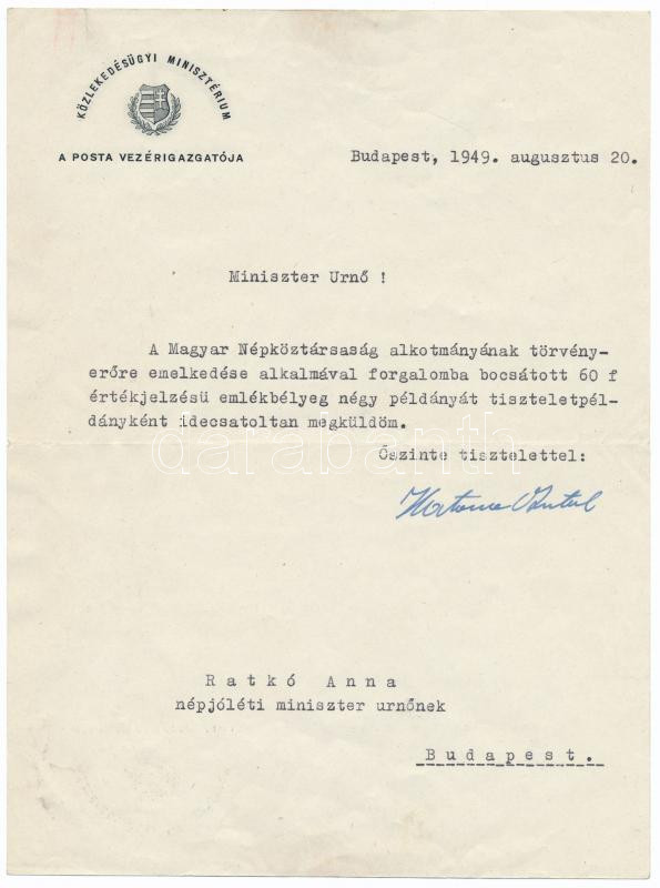 Description: 1949 A Magyar Népköztársaság Alkotmányának törvényre emelkedésének alkalmából forgalomba bocsájtott 60f értékű emlékbélyeg tisztelet példányát küldi Katona Antal Ratkó Anna Népjóléti miniszter úrnőnek. 22,5x16,5cm