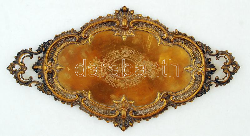Gazdagon díszített dekoratív réz tálca, közepén monogrammal, 41,5×22,5...