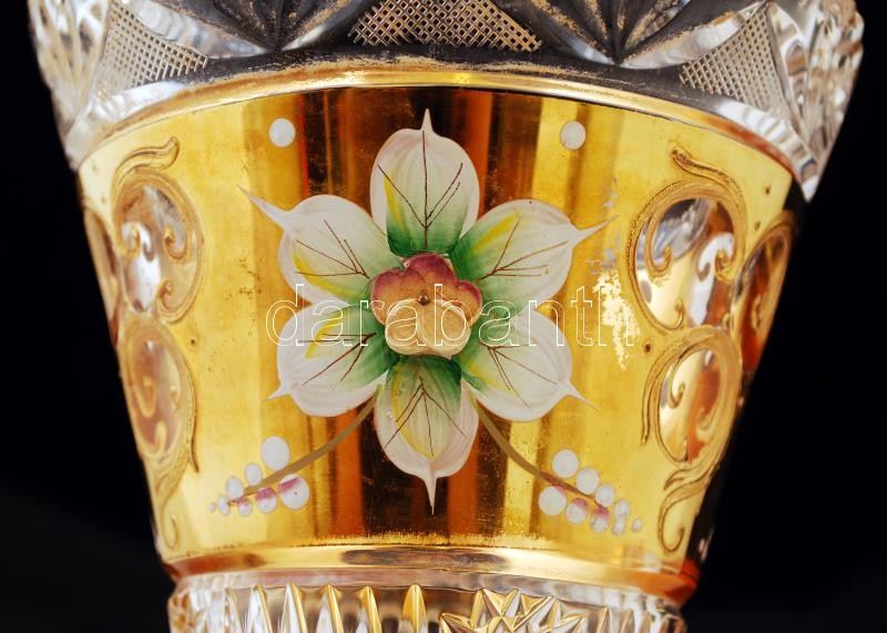 Díszes virágmintás csiszolt, aranyozott ólomkristály váza, matricás, j...