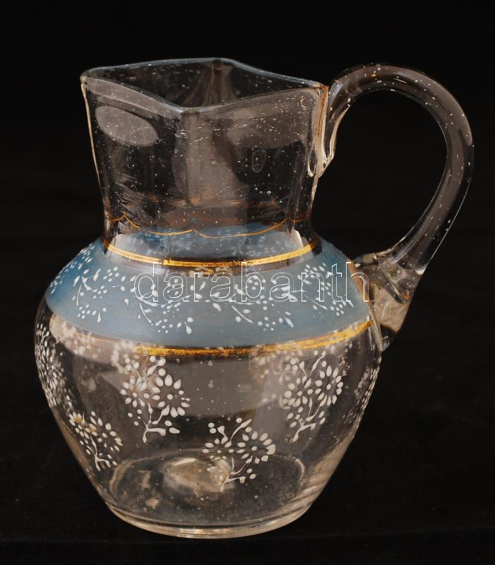 Fújt, zománc festett kis üvegkancsó, hibátlan, m: 11 cm