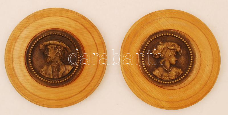 Férfi és női portré, 2 db falra akasztható réz plakett, fa alapzaton, d: 15 cm