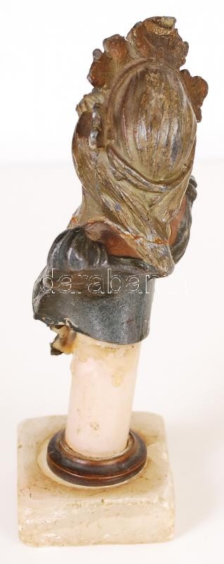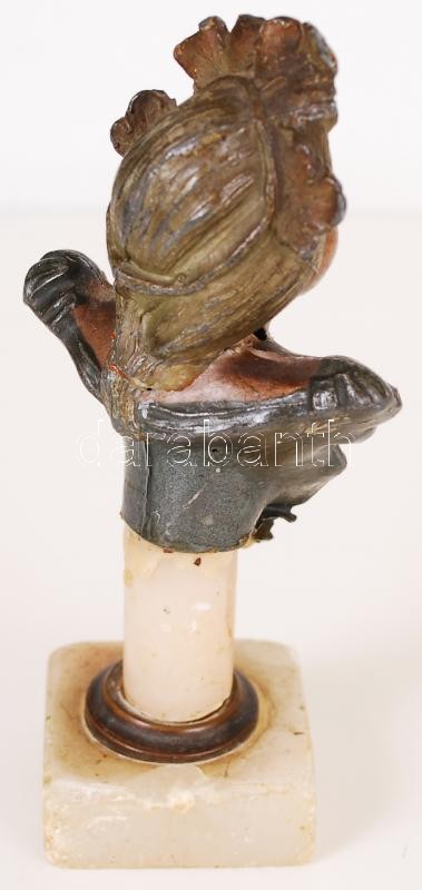 Festett spiáter szecessziós hölgy szobor alabástrom talpazaton, sérült, m: 15 cm