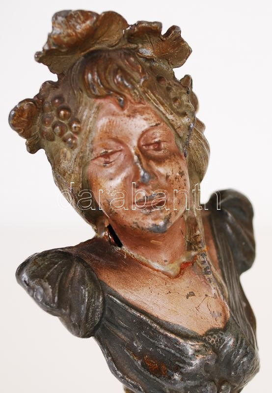 Festett spiáter szecessziós hölgy szobor alabástrom talpazaton, sérült...