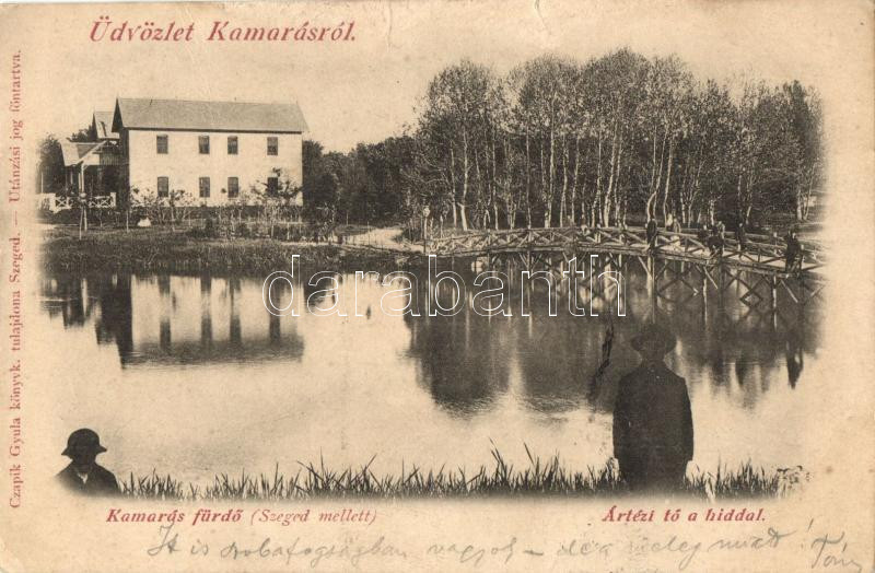Kamarás-fürdő (Szeged mellett), artézi tó a híddal; kiadja Czapik Gyul...