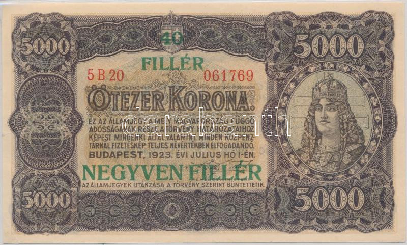 1923. 5000K T.W nyomdahely jelöléssel "40 FILLÉR NEGYVEN FILLÉR" felülbélyegzéssel T:II-,III szép papír kettő hajtással, kis szakadás, szamárfülek