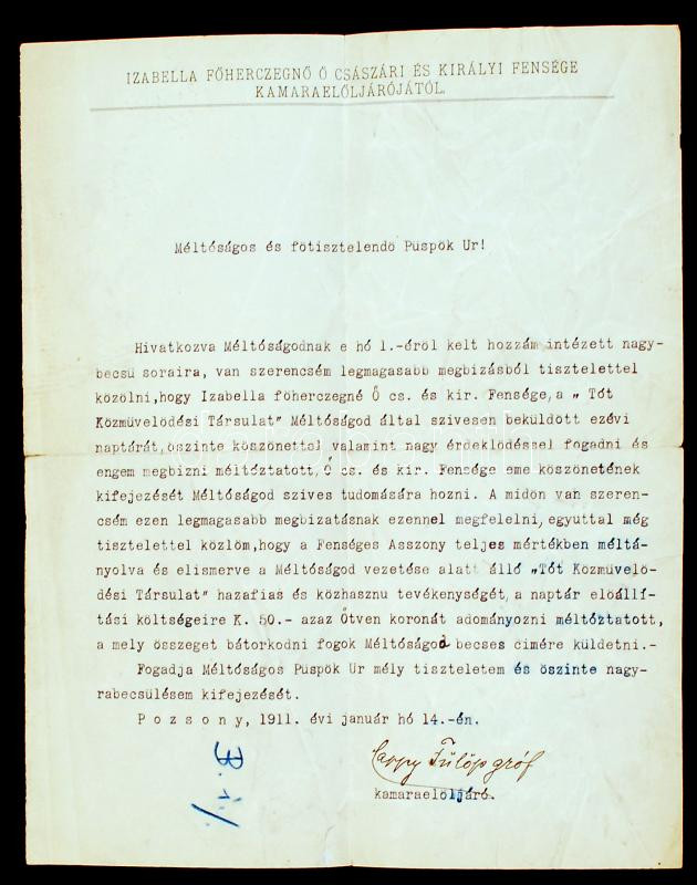 1911 Pozsony, Cappy Fülöp, Anna főhercegnő kamaraelőljárójának aláírása a Tót Közművelődési Társulatról szóló gépelt levélen