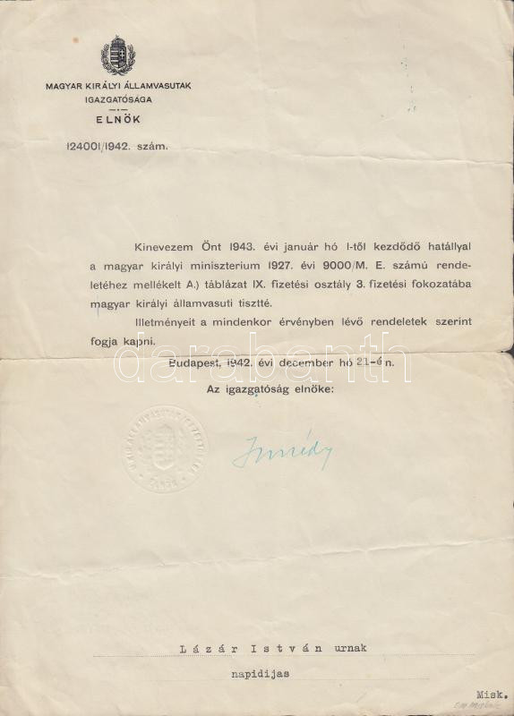 Description: 1942 Bp., Imrédy Béla (1891- 1946) pénzügyminiszter aláírása A Magyar Királyi Államvasutak Igazgatósága által kiadott kinevezési iraton, gratuláló távirat