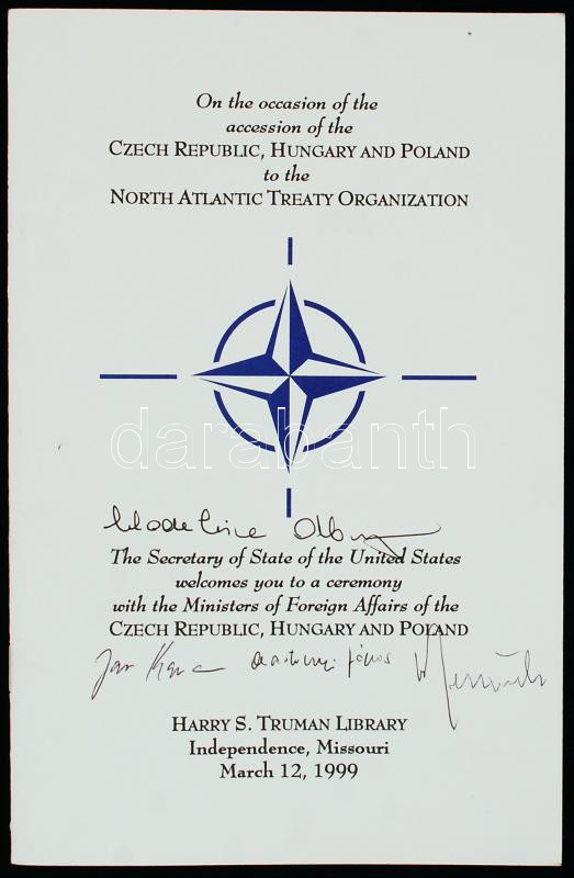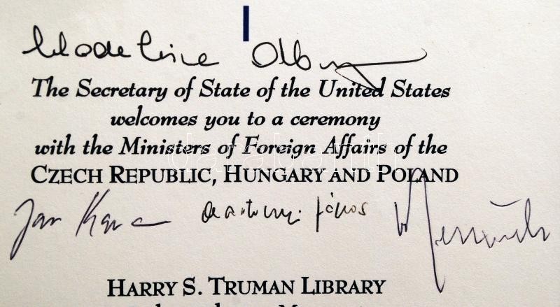 Jan Kavan volt cseh külügyminiszter, Martonyi János volt magyar külügyminiszter, Bronisław Geremek volt lengyel külügyminiszter és Madeleine K. Albright, az Egyesült Államok egykori, első női külügyminiszterének aláírásai a Cseh-, Magyar- és Lengyelország NATO-csatlakozása alkalmából tartott rendezvény meghívóján /