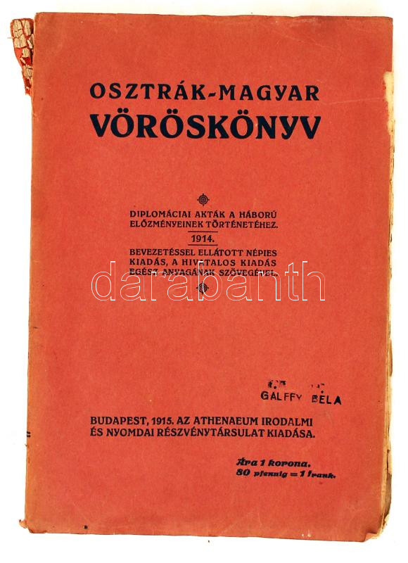 Osztrák-magyar vöröskönyv. Diplomáciai akták a háború előzményeinek történetéhez, 1914, bevezetéssel ellátott népies kiadás, a hivatalos kiadás egész anyagának szövegével. Bp., 1915, Athenaeum. Kiadói papírkötés, gerincnél szakadt, néhány lap kijár, kopottas állapotban.
