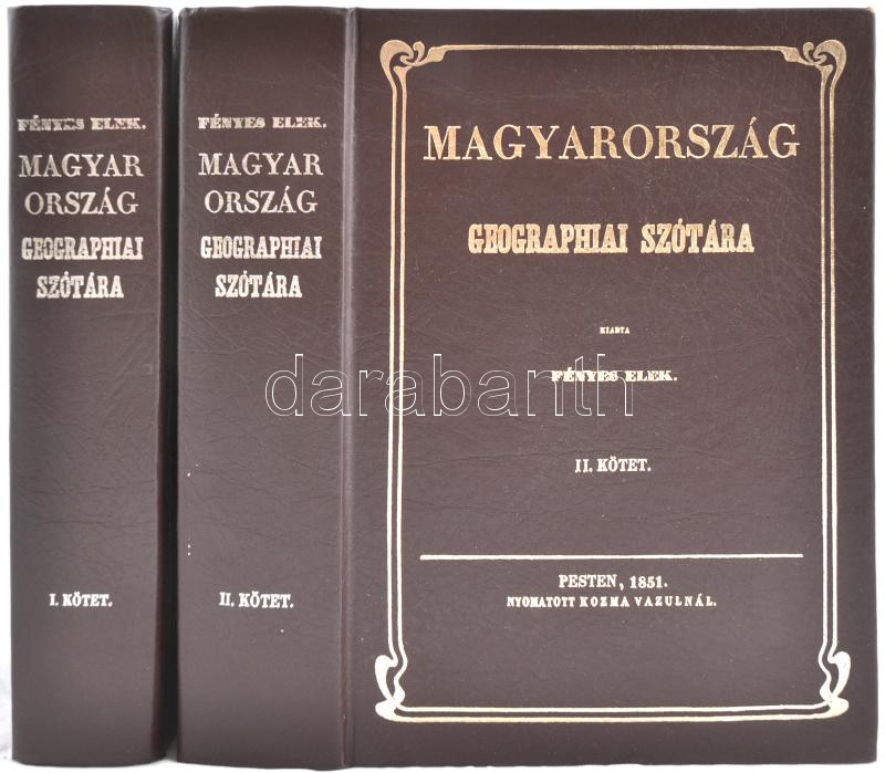 Description: Fényes Elek: Magyarország geographiai szótára, mellyben minden város, falu és puszta, betürendben körülményesen leiratik I. II. kötet. Pest, 1851, Kozma Vazul. Reprint kiadás (1984), aranyozott műbőr kötésben, jó állapotban.