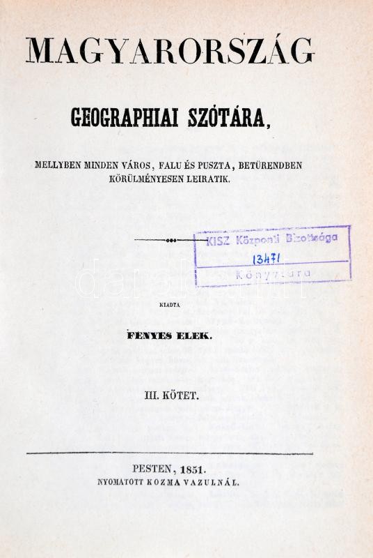 Fényes Elek: Magyarország geographiai szótára, mellyben minden város, ... https://www.darabanth.com/en/224-Online-auction/224.0/Other-collectibles/Books-Travelling-cities~8/Fenyes-Elek-Magyarorszag-geographiai-szotara-mellyben-minden-varos-falu-es-puszta-beturen~II979001