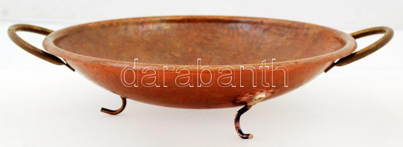 Díszes réz kínáló tál lábakkal, fogantyúval, d: 30 cm
