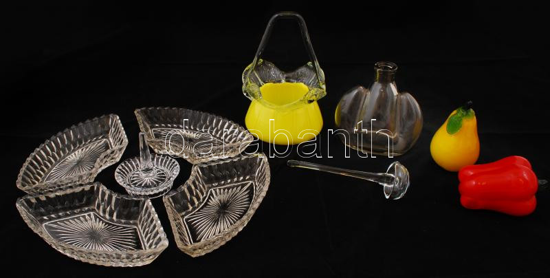 10 db-os vegyes üveg tétel: paprika, körte, kis asztali kosárka, merőkanál, stb.