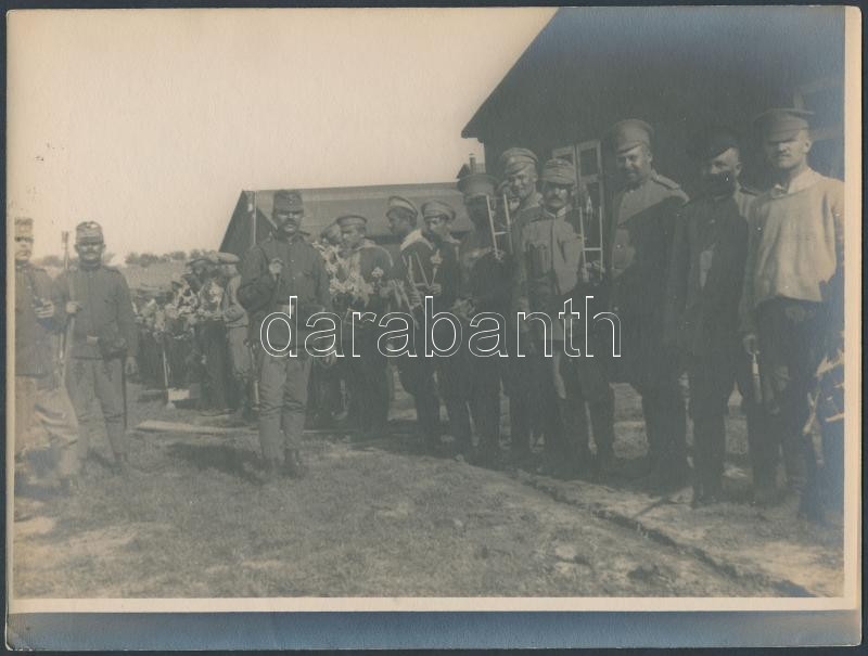 cca 1916-1918 Orosz hadifoglyok, kezükben a gyermekeiknek készített játékok, faragványok, 18x24 cm