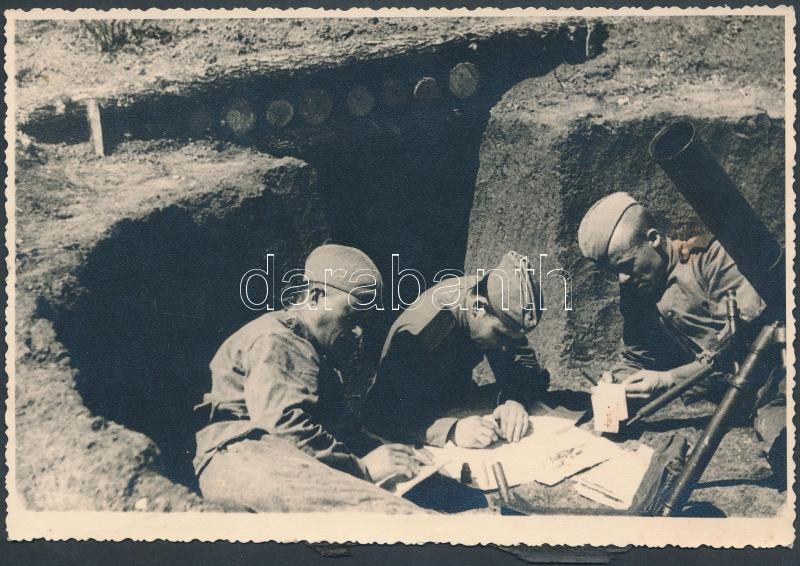cca 1944 Orosz katonák a lövészárokban, az aknavető árnyékában postabontás, levélírás idején, oroszul feliratozott (propaganda?) fotó, 12x17 cm