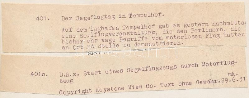 1931 Keystone fotó egy berlini vitorlázó repülőgép bemutatóról, németül feliratozott sajtófotó, sarka hiányzik, 13x18 cm
