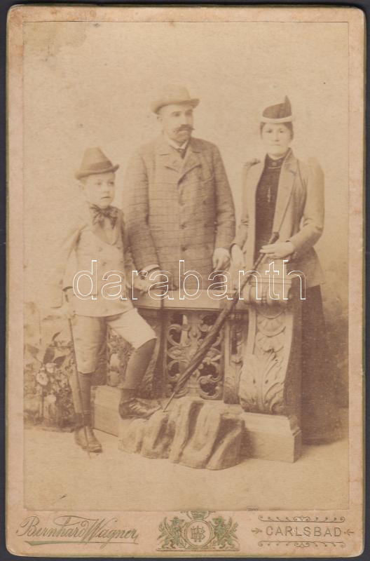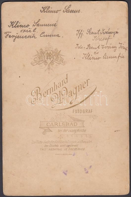 Magyar család karlsbadi fotóműhelyben készült fényképe, hátulján felir...