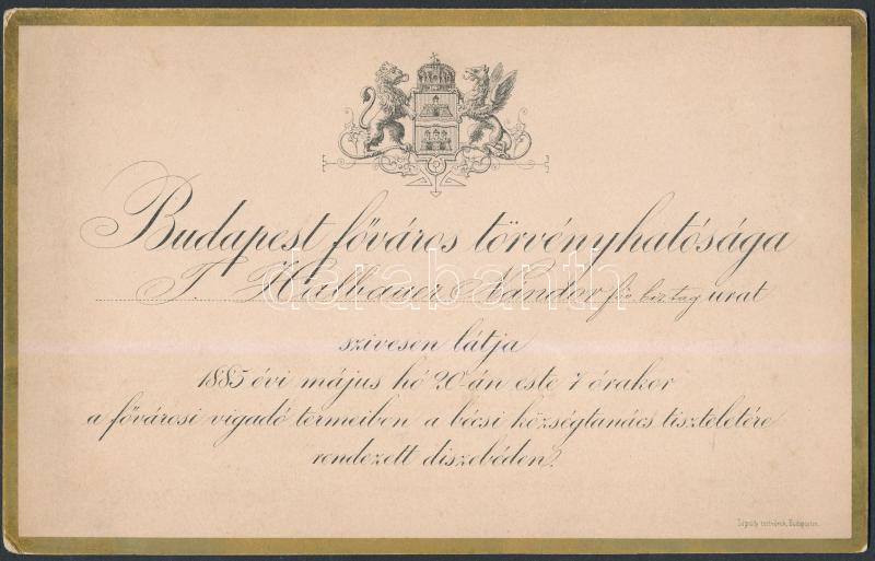 1885 Budapest Székesfőváros Törvényhatósága kétnyelvű meghívó a bécsi ... https://www.darabanth.com/en/224-Online-auction/224.0/Other-collectibles/Printed-Materials~6/1885-Budapest-Szekesfovaros-Torvenyhatosaga-ketnyelvu-meghivo-a-becsi-kozsegtanacs-ti~II983579