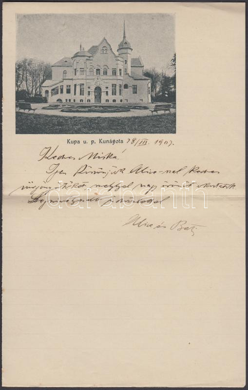 1907 Levélpapír a kupai Bíró Albert kastély látképével, rajta a Pekár ...