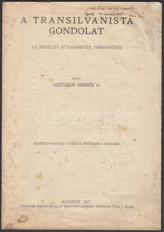 1927 Bp., A transilvanista gondolat, Az erdélyi autonomista törekvések... https://www.darabanth.com/en/224-Online-auction/224.0/Other-collectibles/Printed-Materials~6/1927-Bp-A-transilvanista-gondolat-Az-erdelyi-autonomista-torekvesek-irta-dr-Asztalos-Miklo~II984510