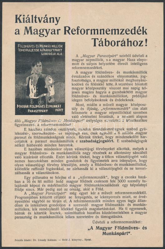 cca 1930-1940 "Kiáltvány a Magyar Reformnemzedék Táborához!", A Magyar Földműves- és Munkáspárt röplapja