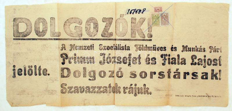 cca 1938-1940 A Nemzeti Szocialista Földműves és Munkás Párt választási plakátja, 56x26 cm
