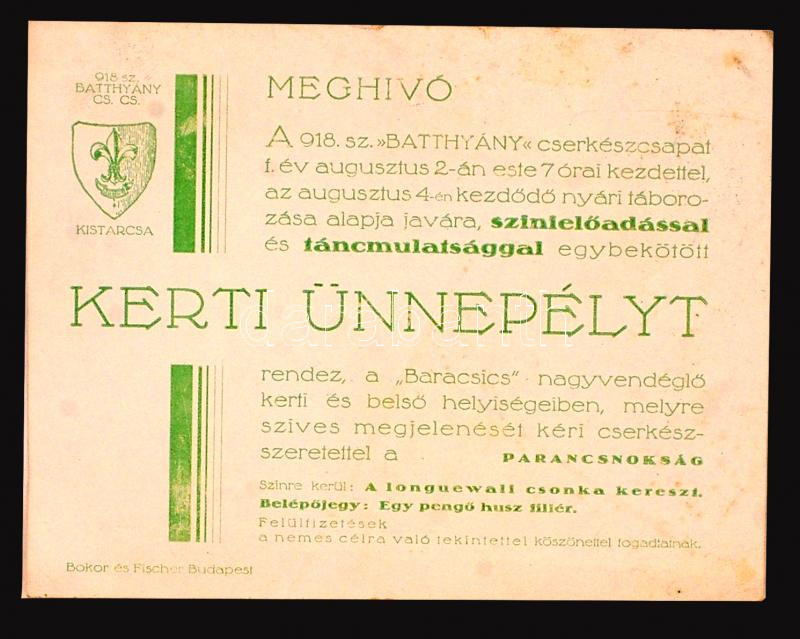 cca 1926-1940 A 918. Batthyány cserkészcsapat meghívója színi előadással és táncmulatsággal egybekötött kerti ünnepélyére